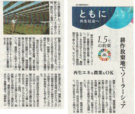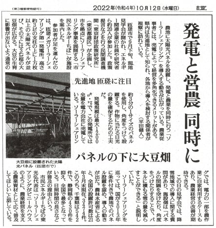 2022年10月12日発行の読売新聞に、弊社のソーラーシェアリングの取り組みについて、記事を掲載いただきました。