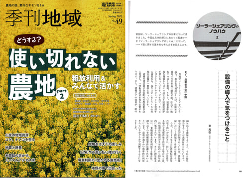 『季刊地域』2022年春 49号(出版:農文協)に、弊社代表・東の執筆記事『ソーラーシェアリングノウハウ2 - 設備の導入で気をつけること』を掲載いただきました。