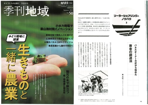 『季刊地域』2022年夏 50号(出版:農文協)に、弊社代表・東の執筆記事『ソーラーシェアリングノウハウ3 - パネルオーナー方式から始めた資金の調達方法』を掲載いただきました。今回が連載3回目となります♪