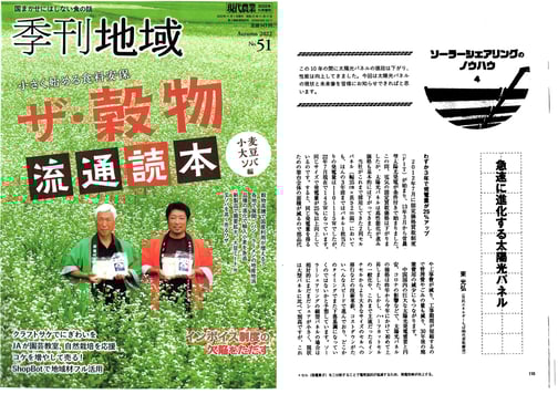 『季刊地域』2022年秋 51号(出版:農文協)に、弊社代表・東の執筆記事『ソーラーシェアリングノウハウ4 - 急速に進化する太陽光パネル』を掲載いただきました。今回が連載4回目となります♪