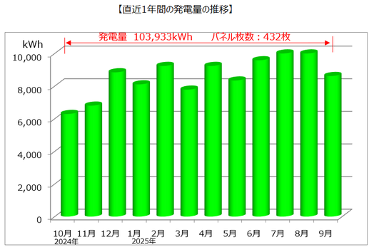 直近1年間(2024年10月~2025年9月)の1kWシステム当たりの発電量は1,458kWhとなっています。