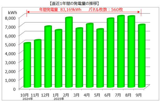 直近1年間(2024年10月~2025年9月)の1kWシステム当たりの発電量は1,340kWhでした。