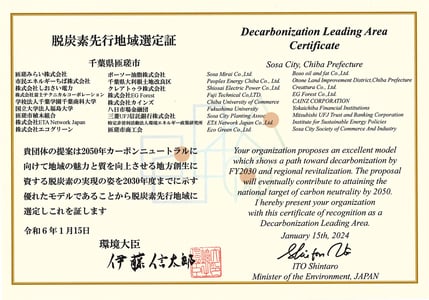 topic · 2024/01/16 【匝瑳市】脱炭素先行地域選定証をいただきました! 2023年11月7日に匝瑳市が「脱炭素先行地域」に選定され、2024年1月15日に行われた「第4回脱炭素先行地域選定証授与式」で共同提案企業として「脱炭素先行地域選定証」をいただきました! tagPlaceholderカテゴリ: